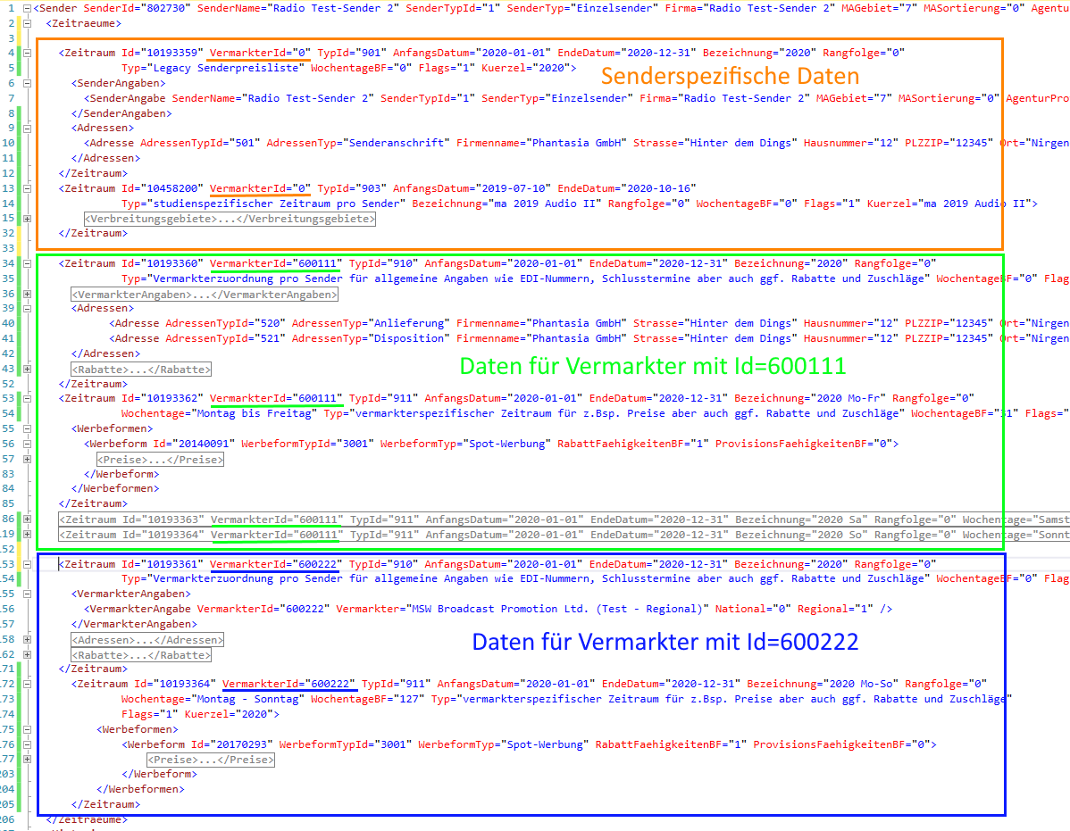 Wurde also bspw. einem bestimmten Client die Vermarkter Id = 600111 und die Sender Id = 802730 zugeordnet und als Berechtigungssatz "vermarkterspezifisch" festgelegt, kann der Client über die API lediglich diejenigen Daten bearbeiten, die in der folgenden Abbildung innerhalb des grün markierten Blocks zu sehen sind:
